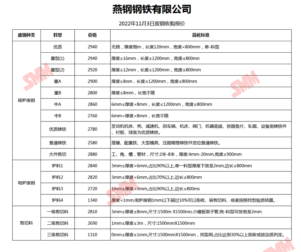 11月3日燕钢钢铁 废钢收购报价