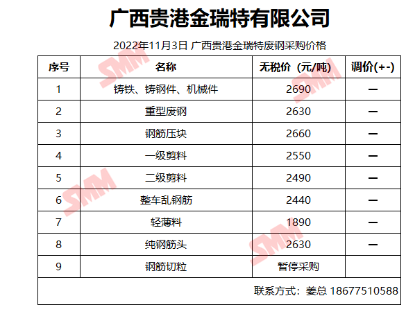 11月3日广西贵港金瑞特 废钢采购报价