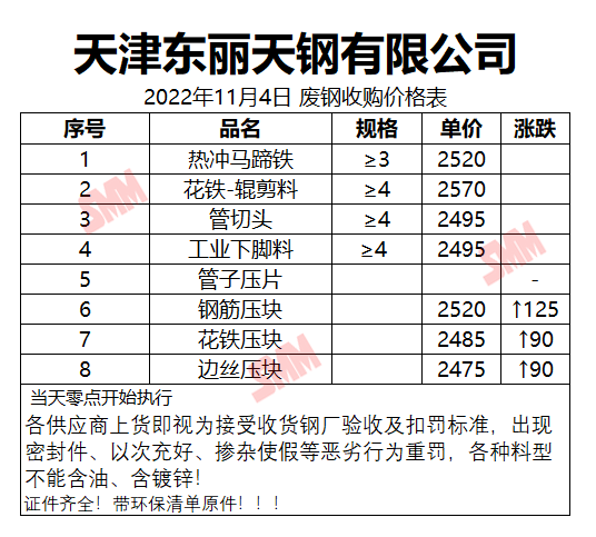 11月4日天津东丽天钢 废钢收购报价