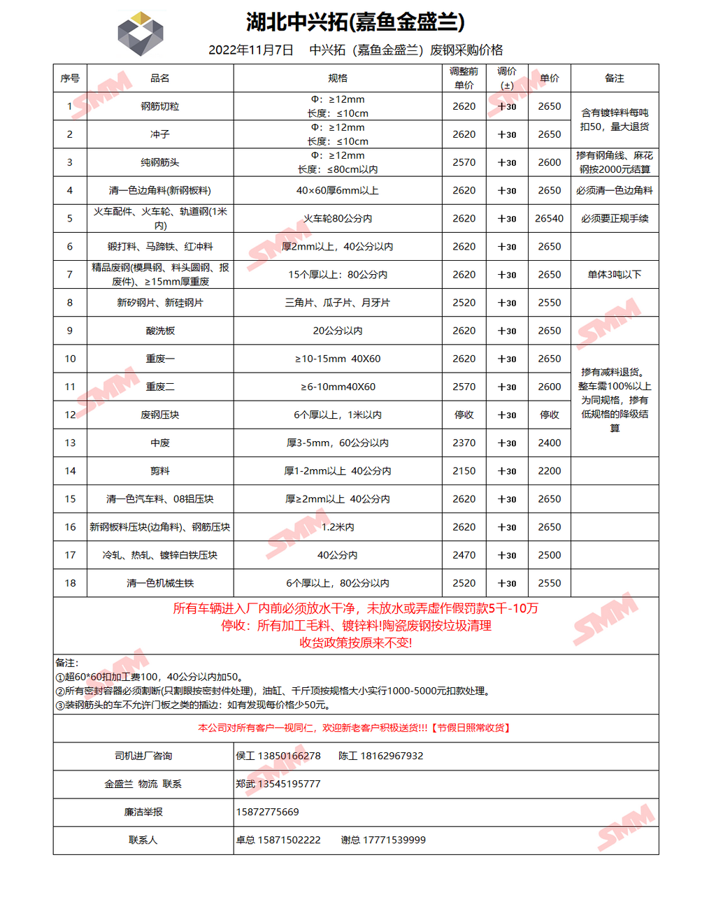 11月7日湖北中兴拓(嘉鱼金盛兰) 废钢采购二次报价