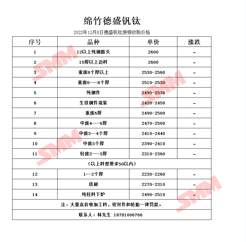 11月8日 绵竹德盛钒钛 废钢收购报价