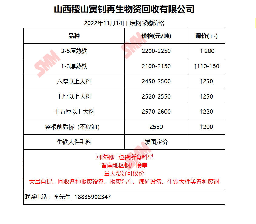 11月14日山西稷山寅钊再生废钢采购报价