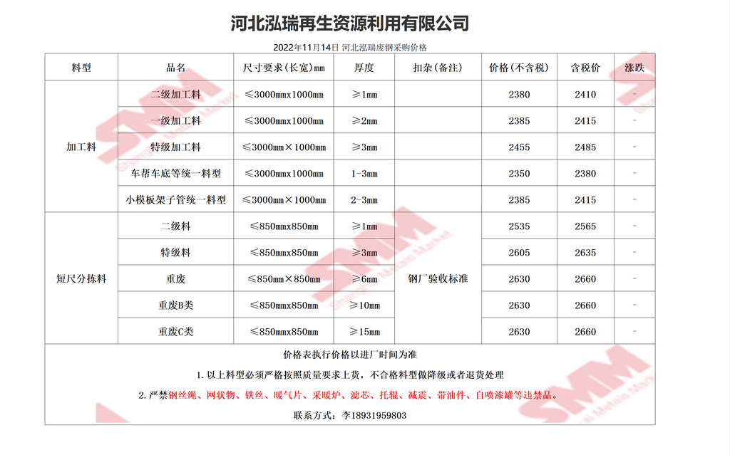 今日 河北泓瑞再生资源利用有限公司 废钢采购报价已更新,有货的朋友欢迎联系我们!