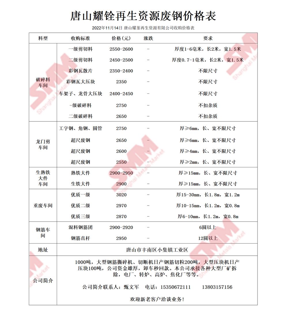 今日唐山耀铨再生资源有限公司 废钢收购报价已更新,有货的朋友欢迎联系我们!