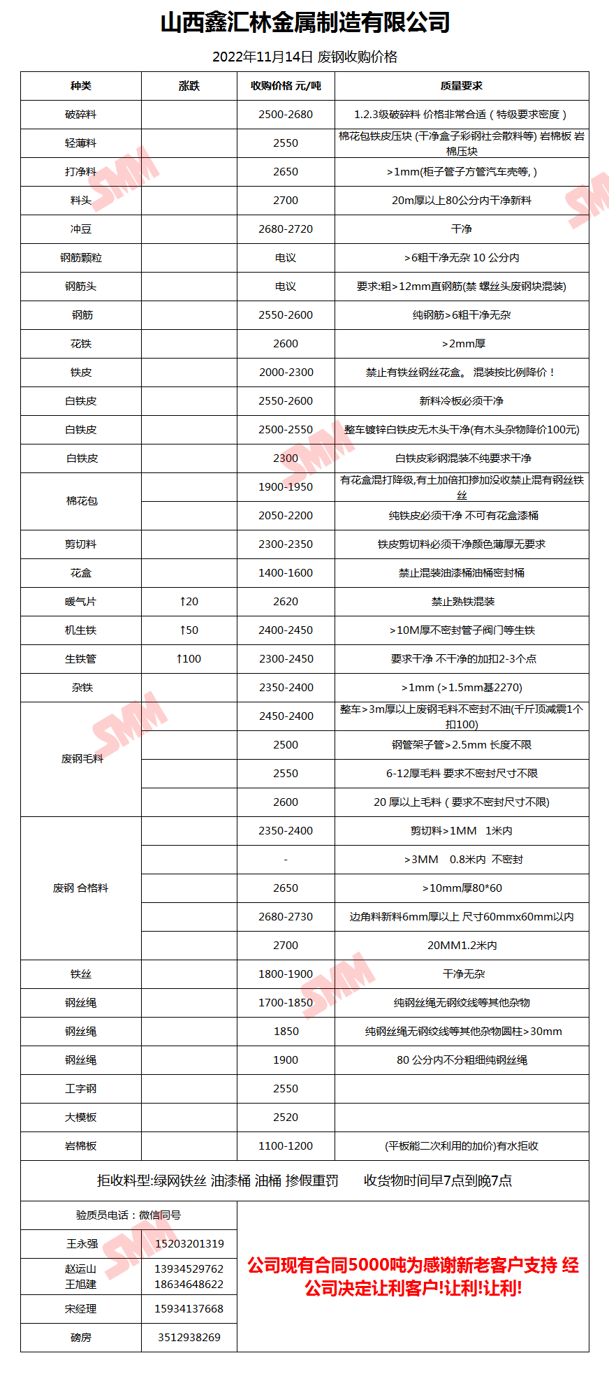 今日山西鑫汇林金属制造有限公司 废钢收购报价已更新,有货的朋友欢迎联系我们!