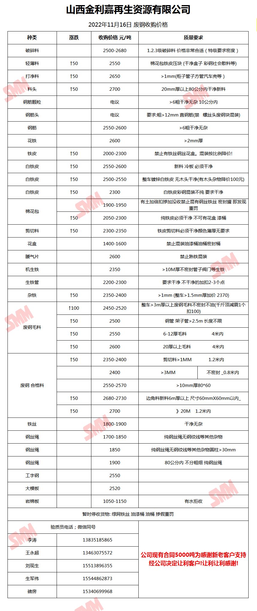 今日山西金利嘉 废钢收购报价已更新,有货的朋友欢迎联系我们!