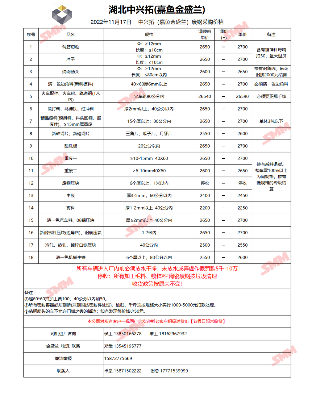 11月17日湖北中兴拓(嘉鱼金盛兰) 废钢采购报价