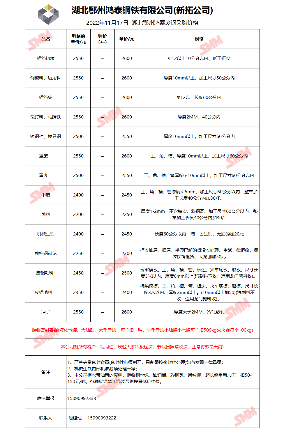 11月17日湖北鄂州鸿泰 废钢采购报价
