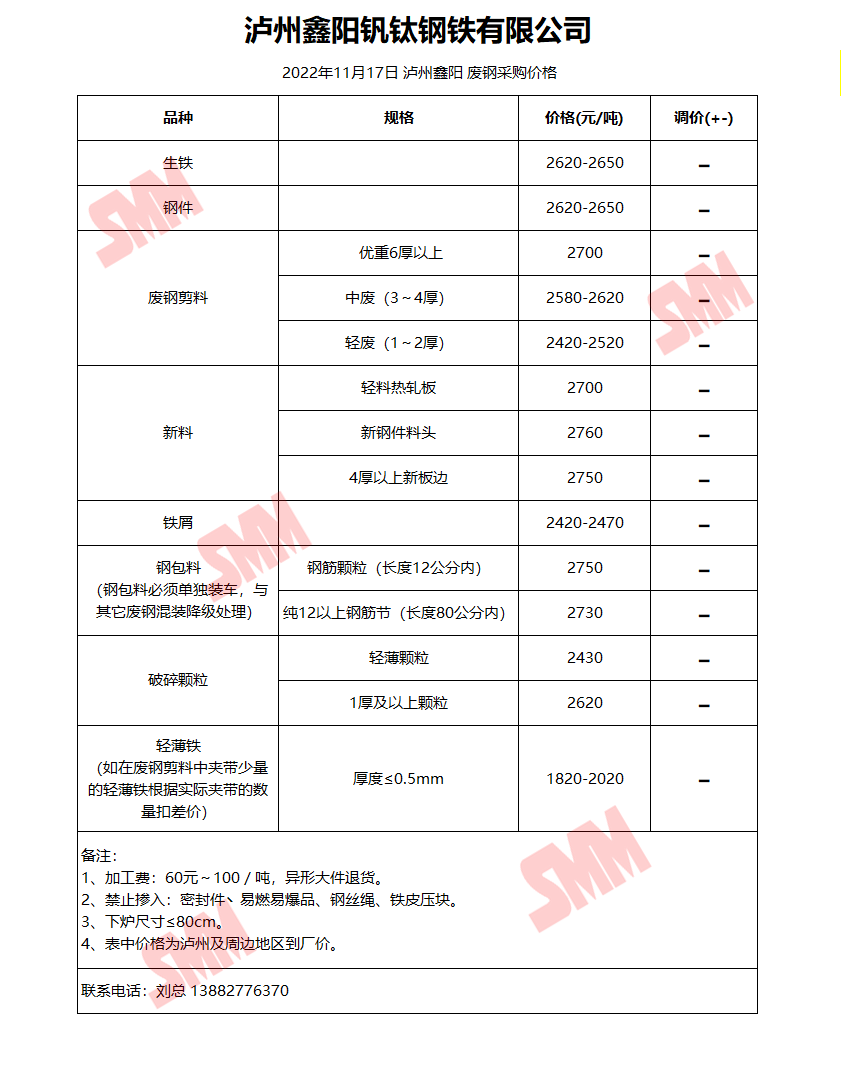 11月17日泸州鑫阳钒钛 废钢采购报价