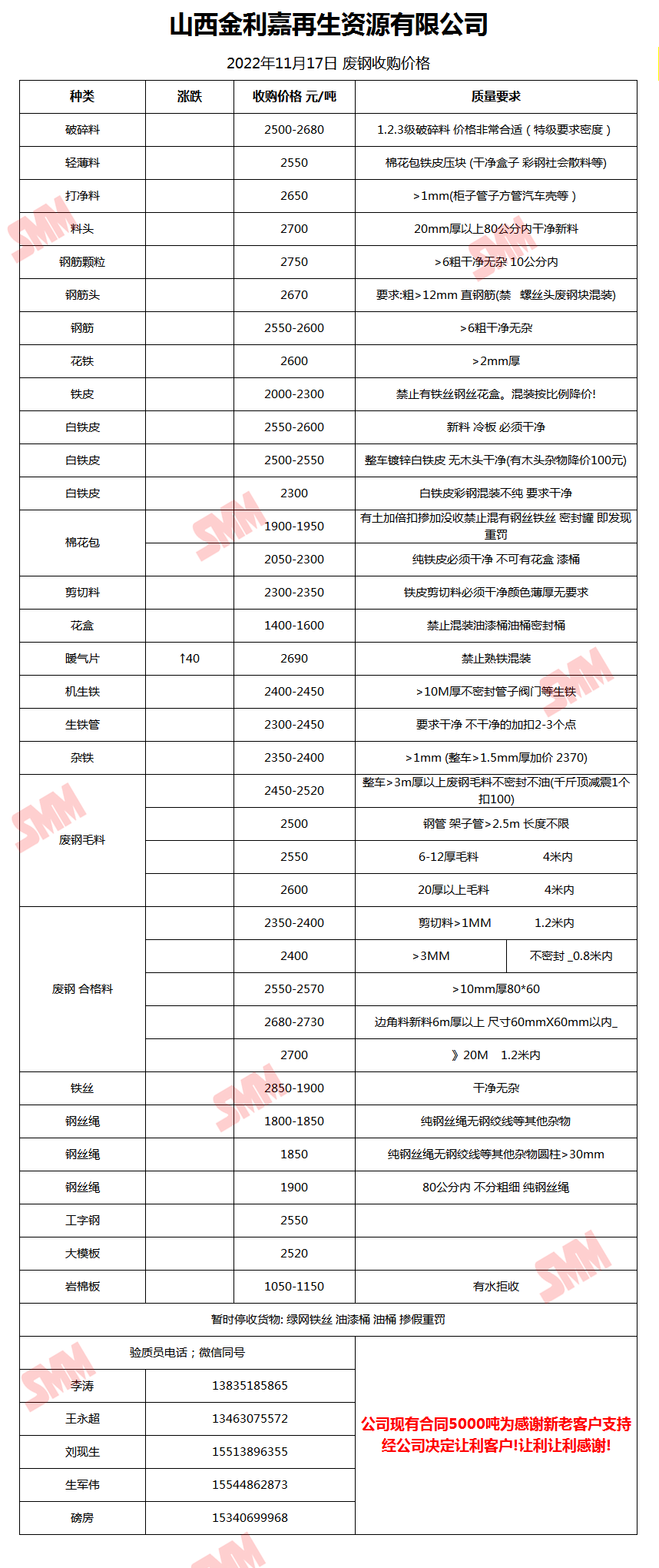 今日山西金利嘉 废钢收购报价已更新,有货的朋友欢迎联系我们!