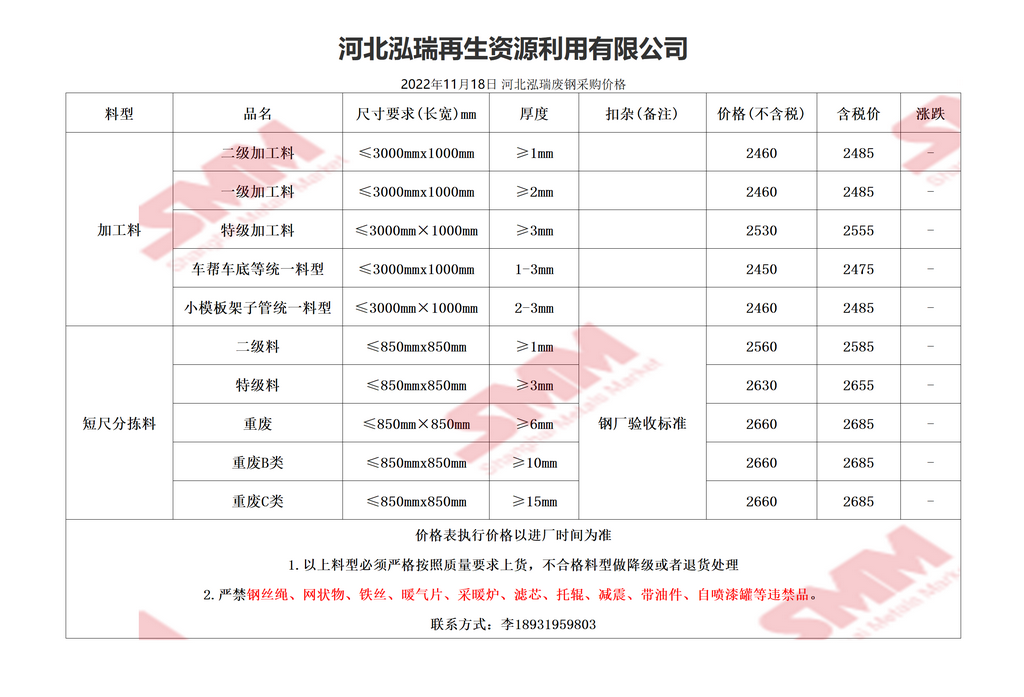 11月18日泓瑞再生 废钢采购报价
