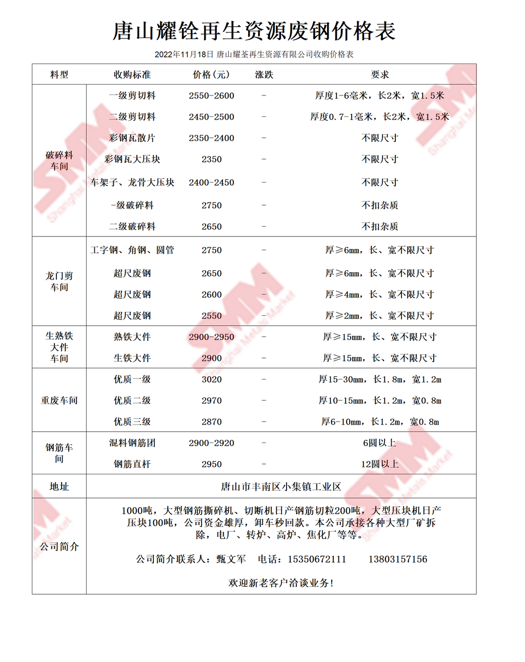 今日唐山耀铨再生资源有限公司 废钢收购报价已更新,有货的朋友欢迎联系我们!