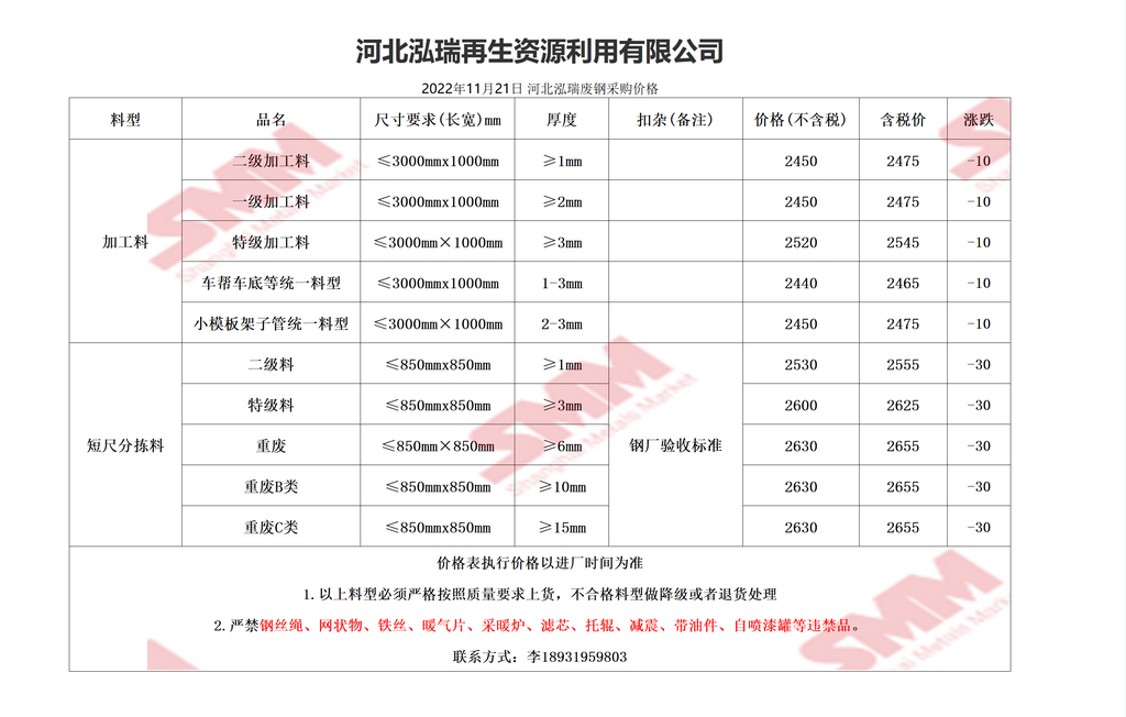 11月21日泓瑞再生 废钢采购报价