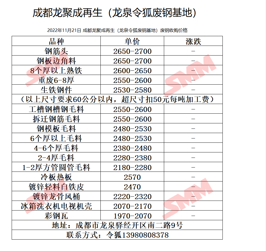 11月21日 成都龙聚成再生 废钢收购价格