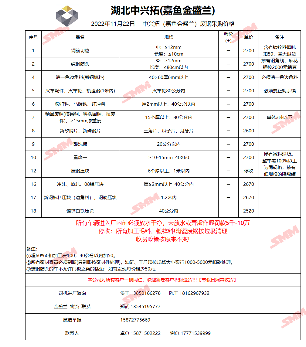 11月22日湖北中兴拓(嘉鱼金盛兰) 废钢采购报价