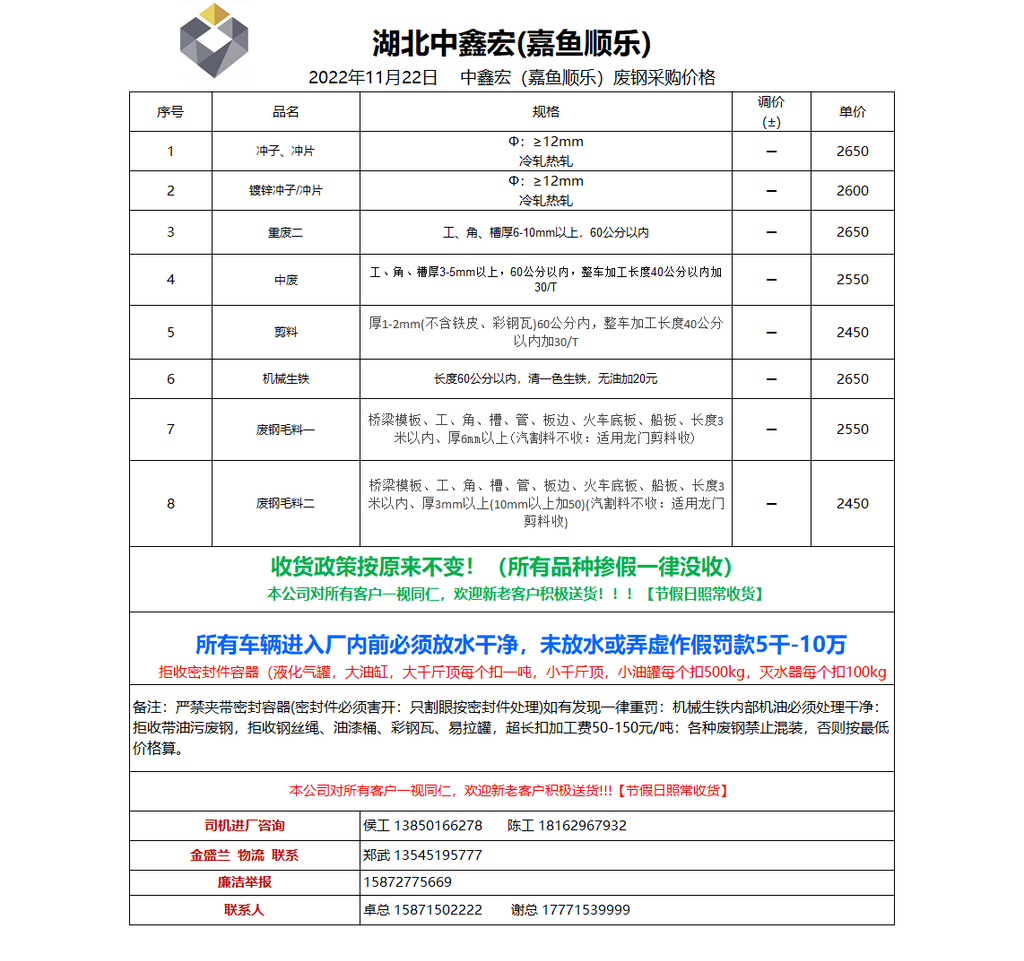 11月22日湖北中鑫宏(嘉鱼顺乐) 废钢采购报价