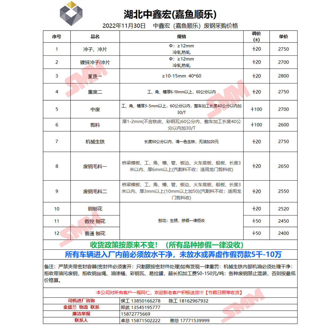11月30日湖北中鑫宏(嘉鱼顺乐) 废钢采购报价