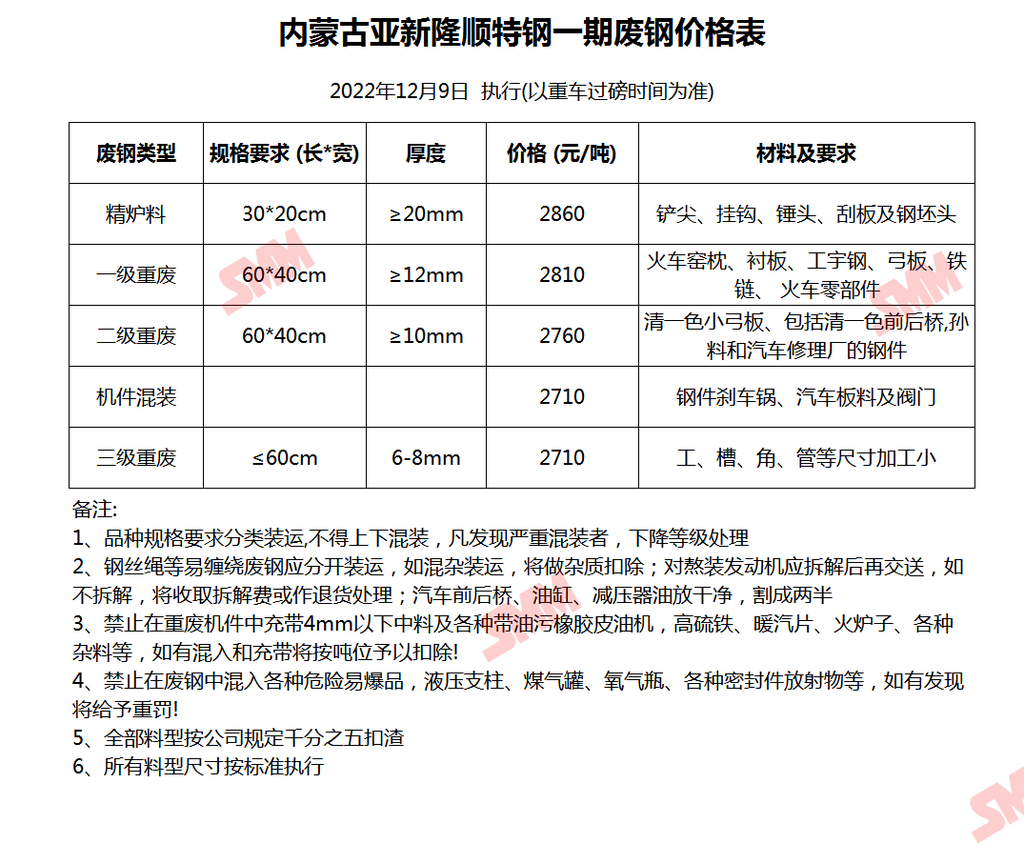 12月9日 内蒙古亚新隆顺特钢一期 废钢收购价格