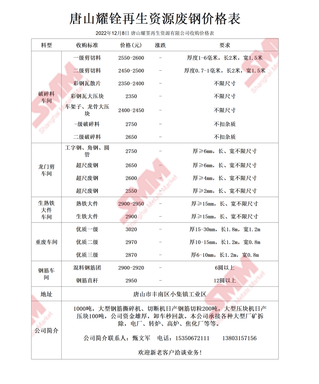 今日唐山耀铨再生资源有限公司 废钢收购报价已更新,有货的朋友欢迎联系我们!