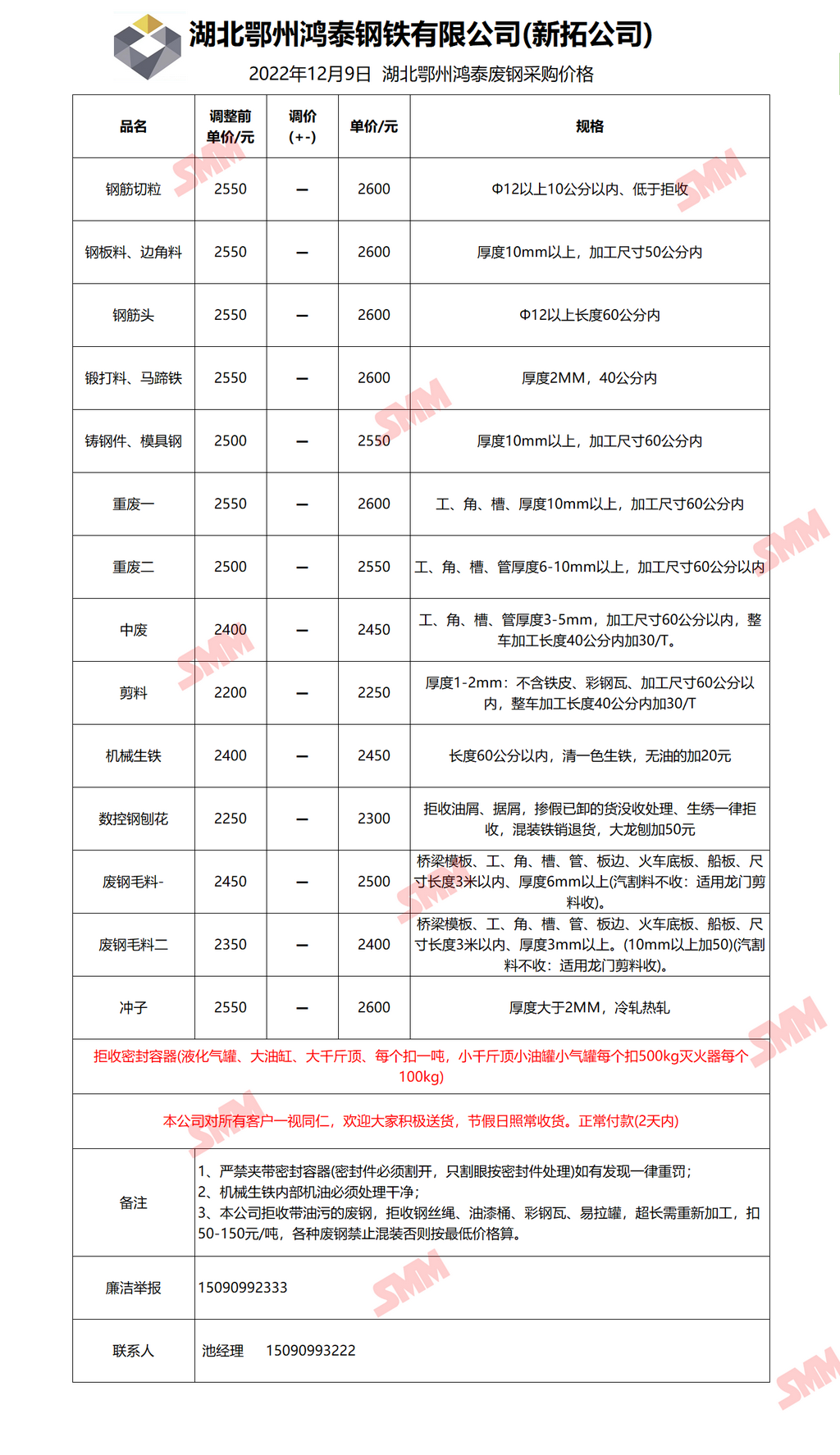 12月9日湖北鄂州鸿泰 废钢采购报价