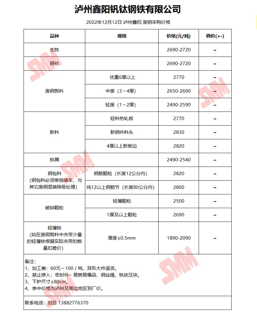 12月12日泸州鑫阳钒钛 废钢采购报价