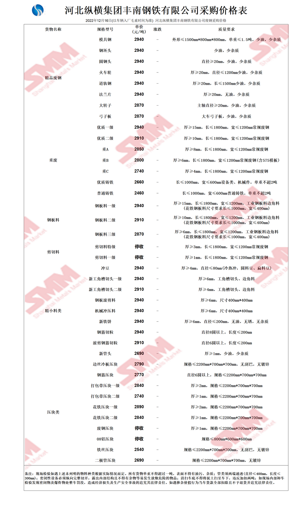 12月16日河北纵横集团丰南钢铁 废钢采购报价