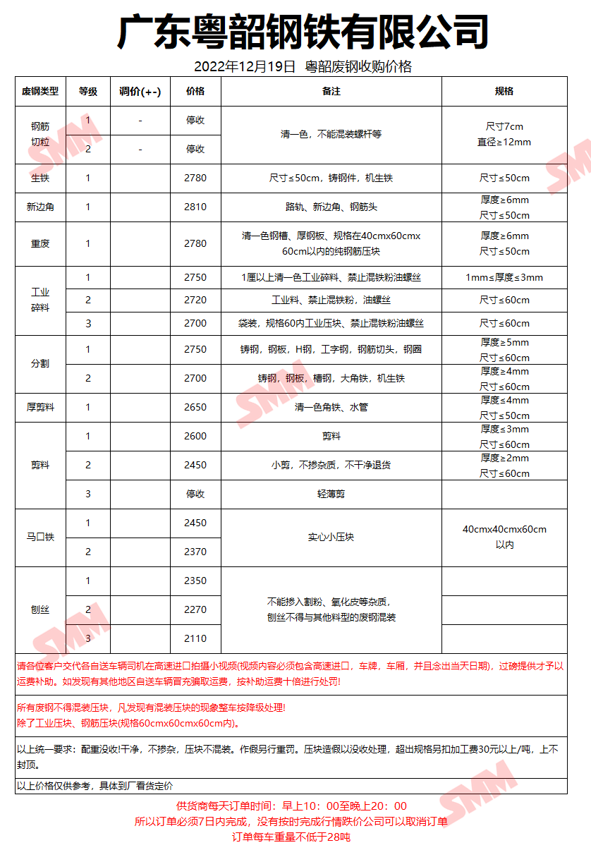 12月19日广东粤韶钢铁 废钢收购报价