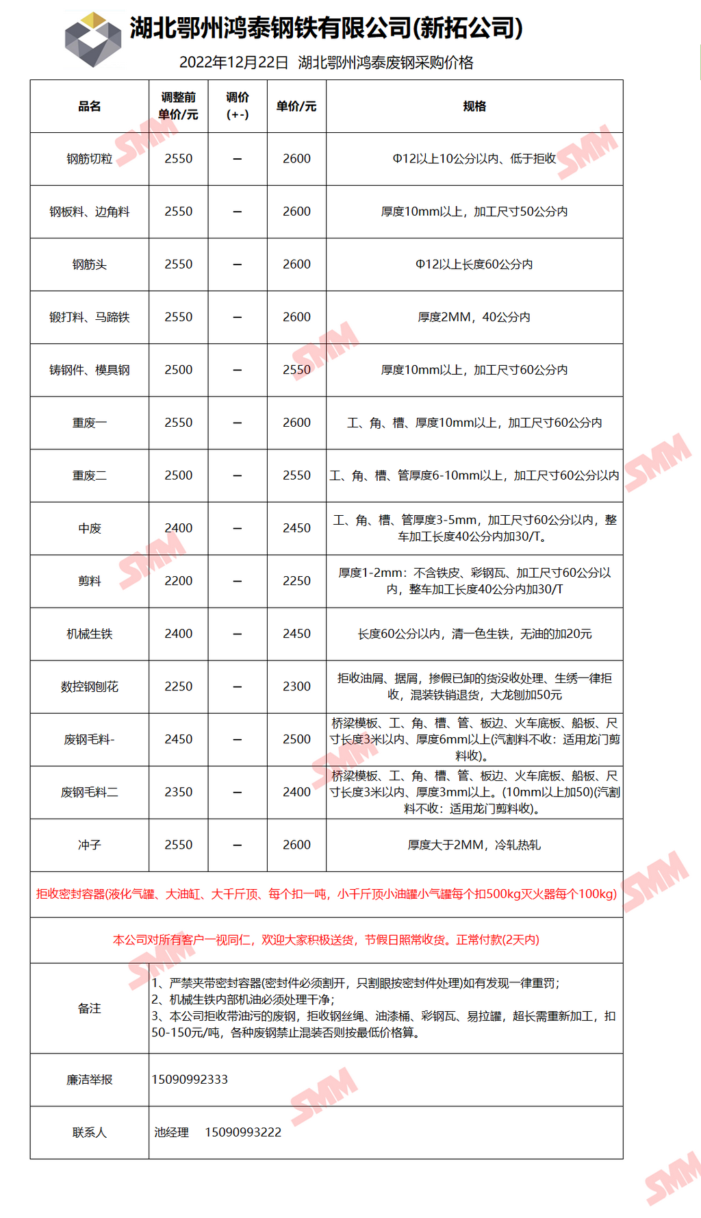 12月22日湖北鄂州鸿泰 废钢采购报价