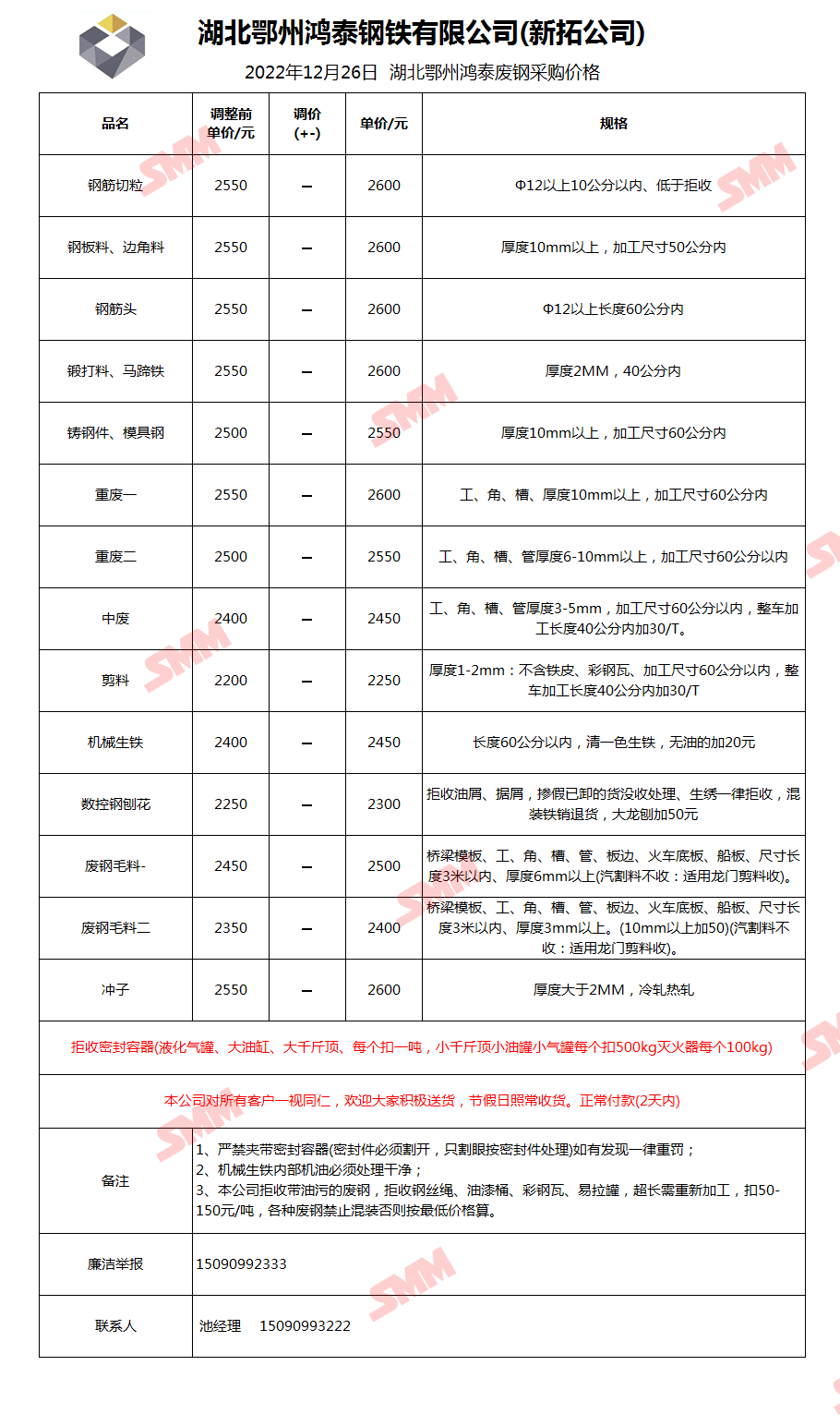 12月26日湖北鄂州鸿泰 废钢采购报价