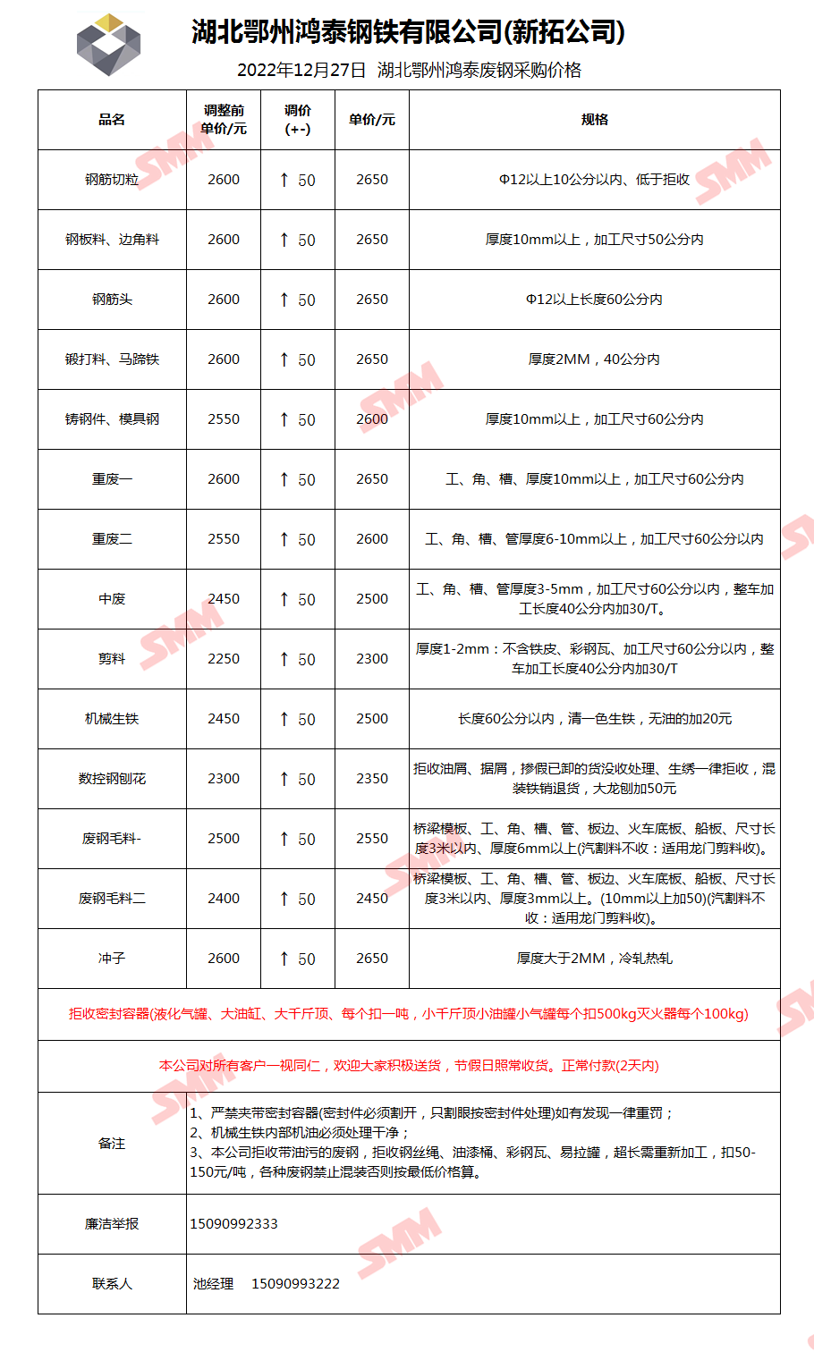 12月27日湖北鄂州鸿泰 废钢采购报价