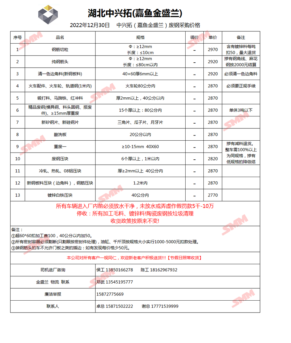 12月30日湖北中兴拓(嘉鱼金盛兰) 废钢采购报价