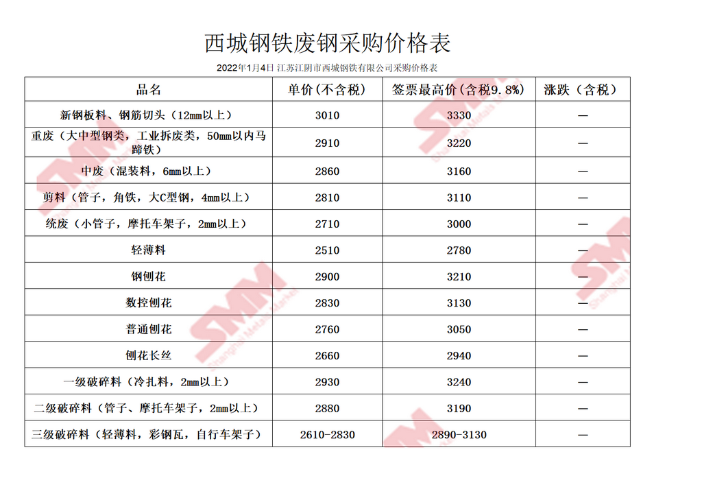1月4日西城钢铁 废钢采购报价