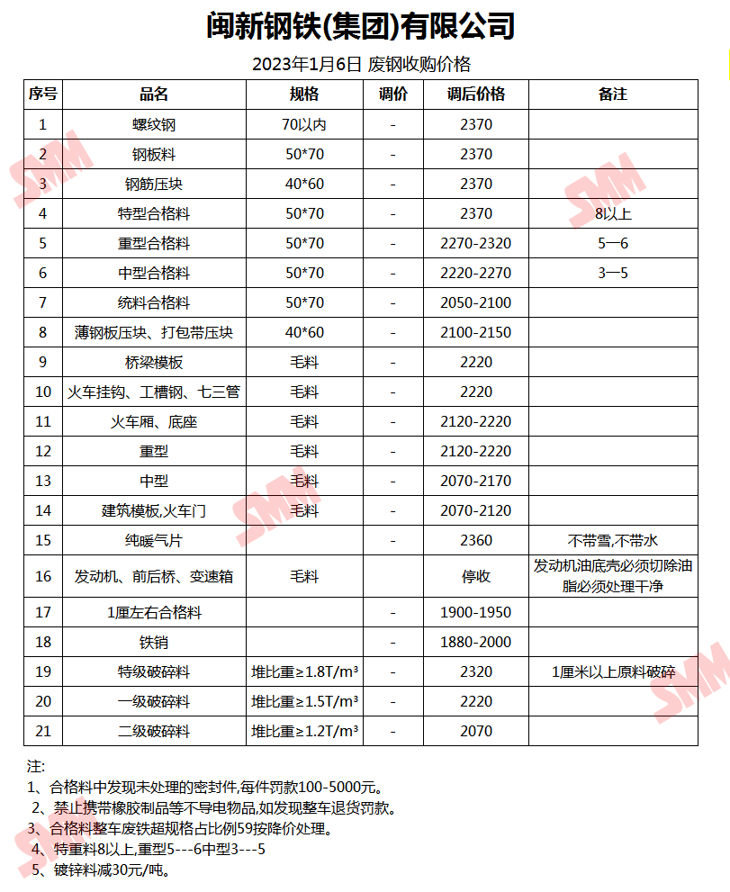 1月6日闽新钢铁(集团)有限公司废钢收购报价