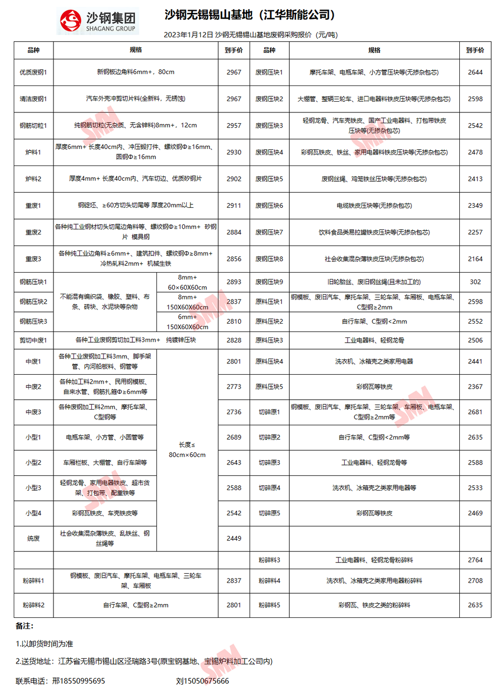 今日沙钢锡山基地 废钢采购报价已更新,有货的朋友欢迎联系我们!