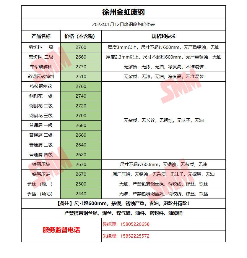 1月12日徐州金虹 废钢收购报价