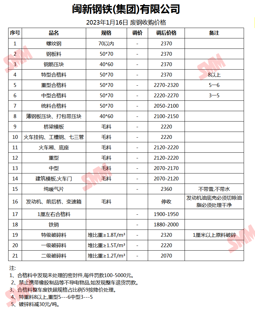 1月16日闽新钢铁(集团)有限公司废钢收购报价