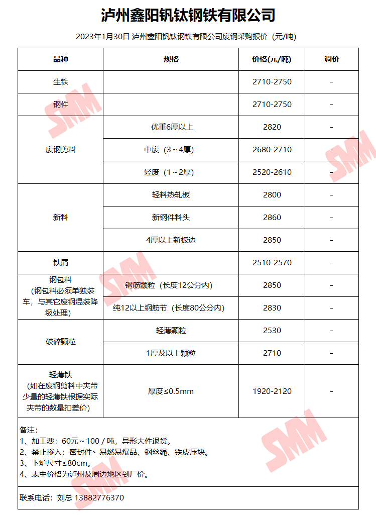 1月30日泸州鑫阳钒钛 废钢采购报价
