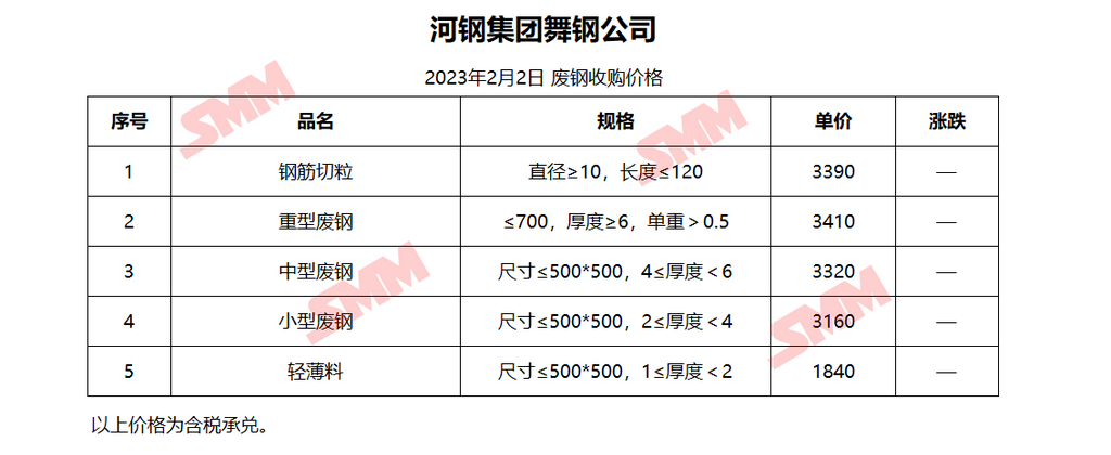 2月2日 河钢集团舞钢公司 废钢收购报价