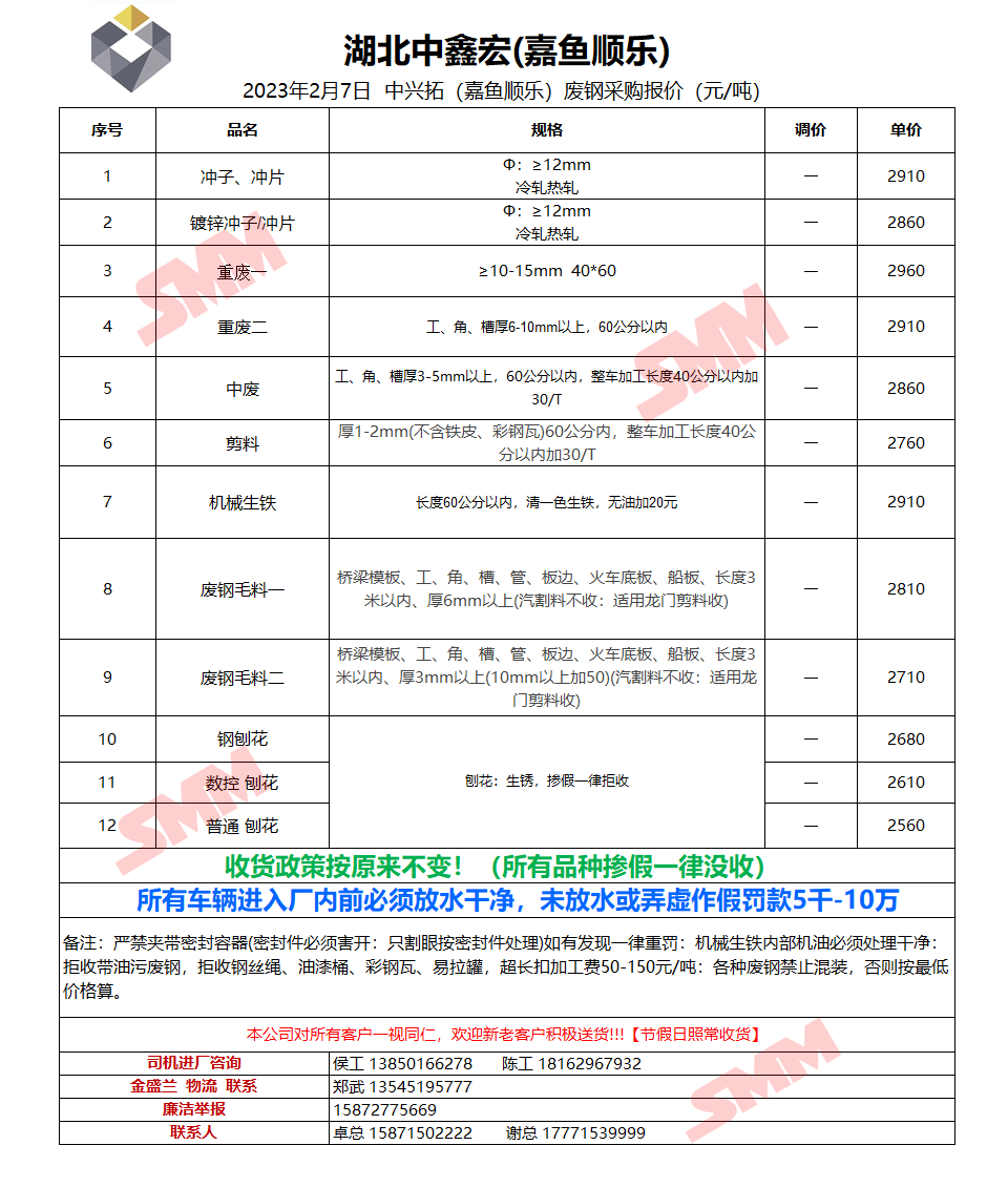 2月7日湖北中鑫宏(嘉鱼顺乐) 废钢采购报价