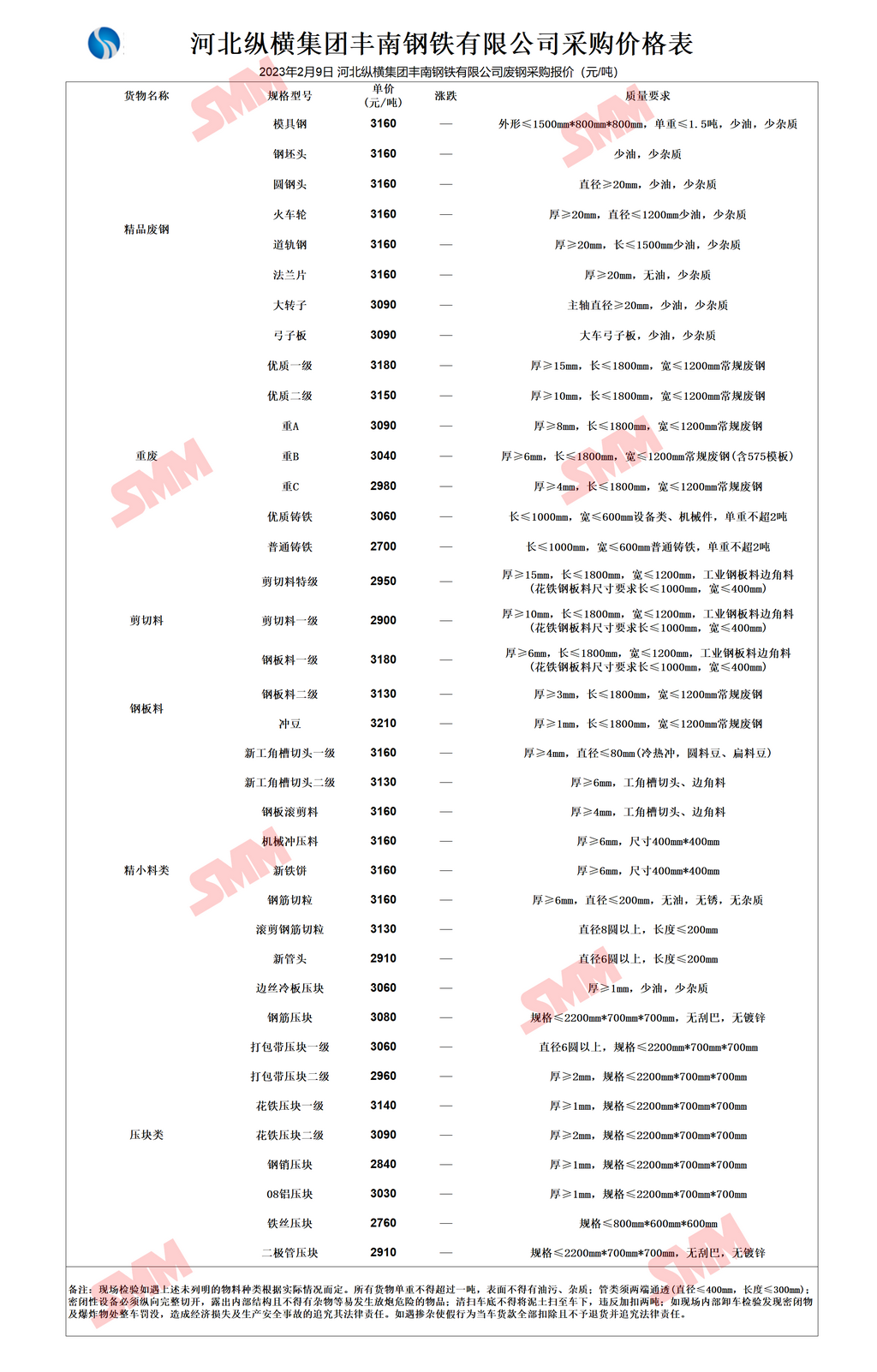 2月9日河北纵横集团丰南钢铁 废钢采购报价