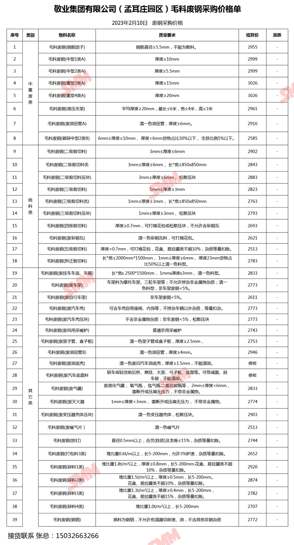 2月10日敬业钢铁(孟耳庄园区) 废钢采购报价