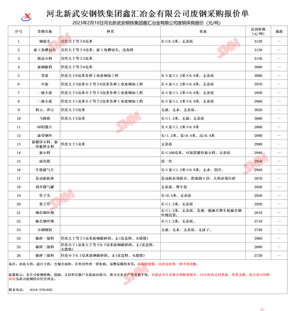 今日 河北新武安钢铁集团鑫汇冶金有限公司 废钢采购报价已更新,有货的朋友欢迎联系我们!