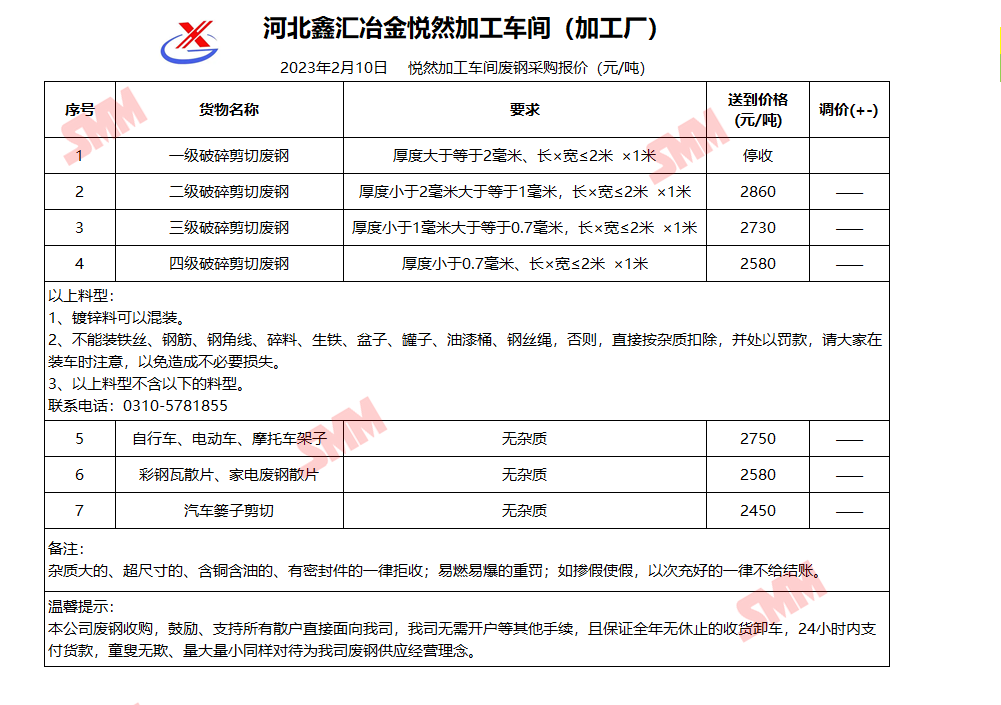 2月10日河北鑫汇冶金悦然加工车间 废钢采购报价