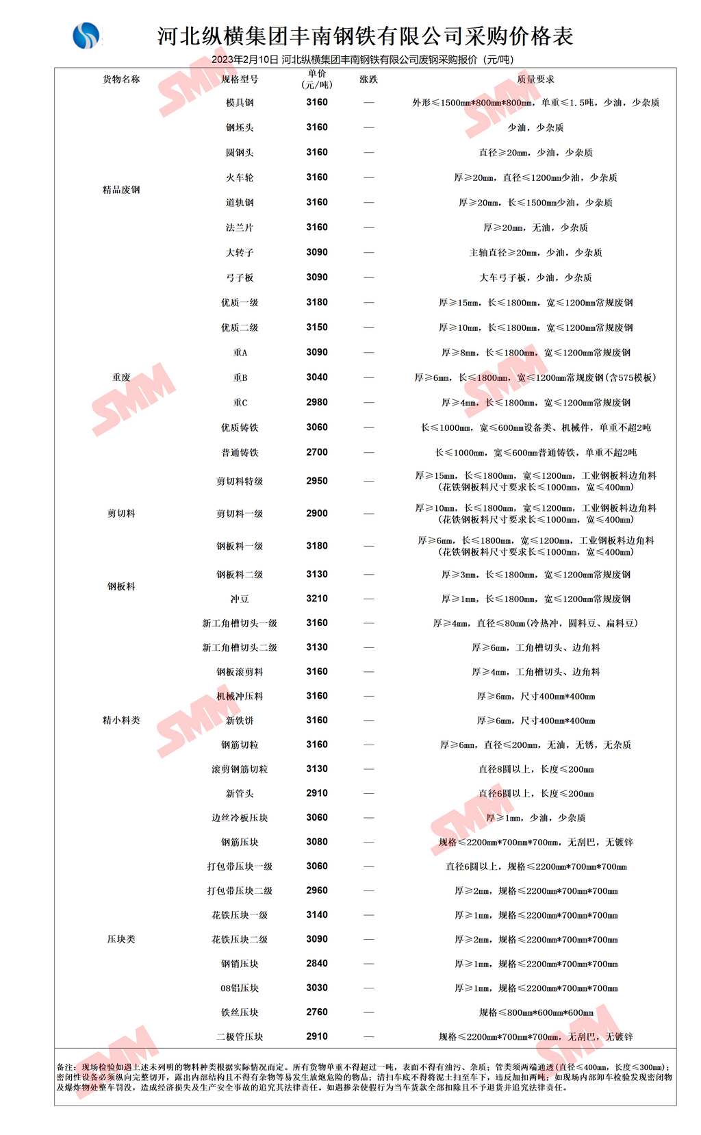 2月10日河北纵横集团丰南钢铁 废钢采购报价