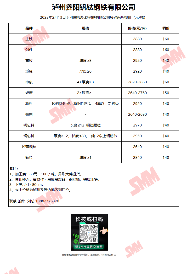 2月13日泸州鑫阳钒钛 废钢采购报价
