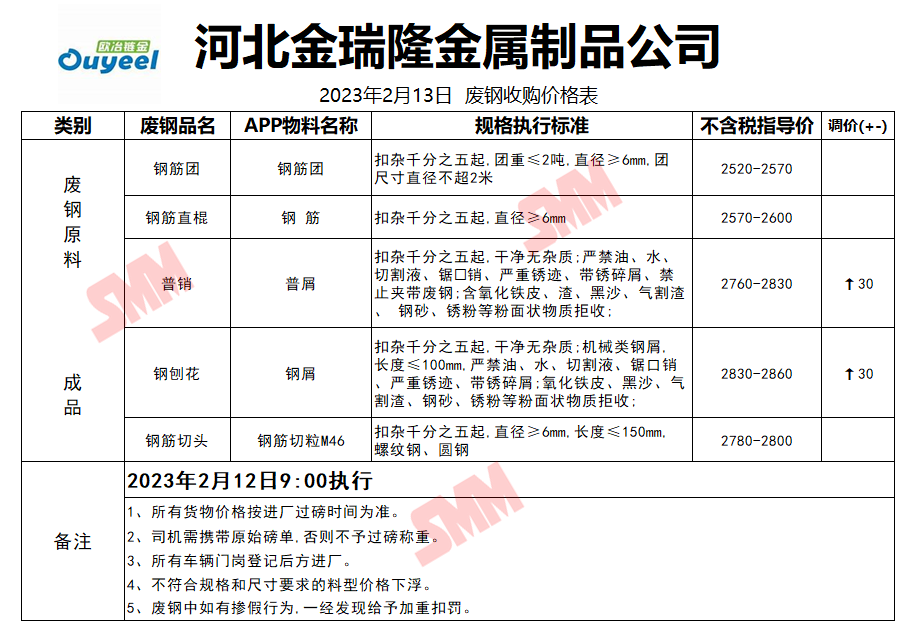 2月13日河北金瑞隆钢铁 废钢收购报价