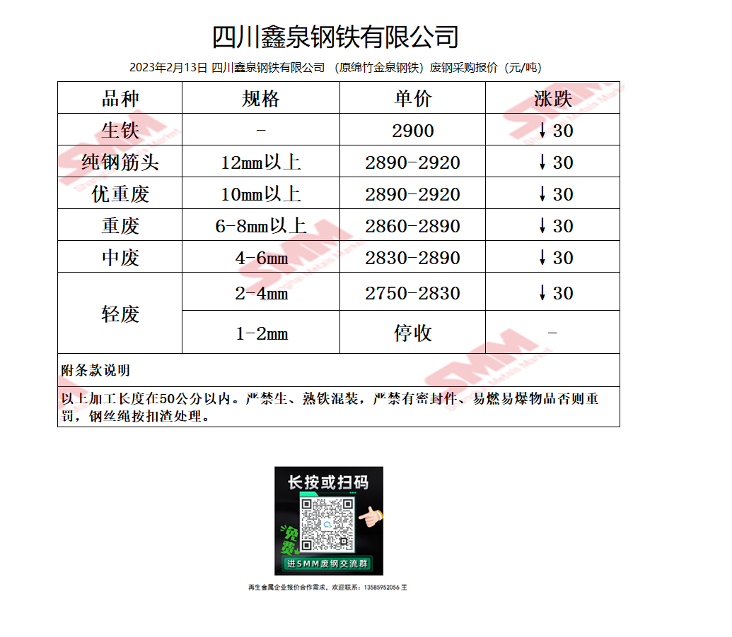2月13日鑫泉钢铁(原绵竹金泉钢铁) 废钢采购报价