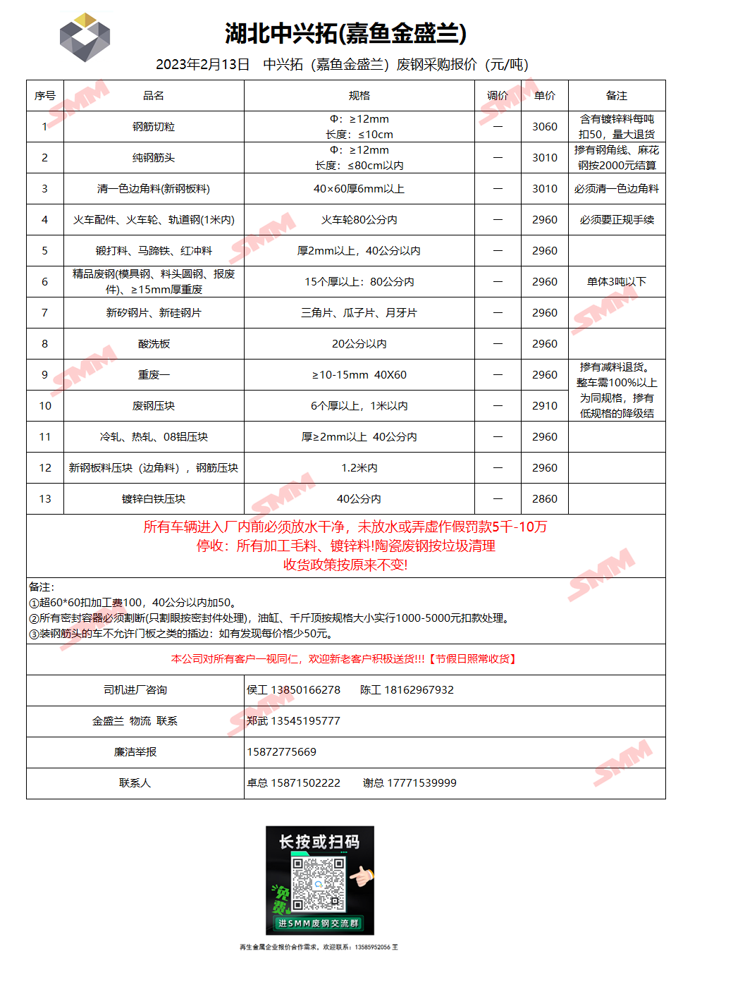 2月13日湖北中兴拓(嘉鱼金盛兰) 废钢采购报价