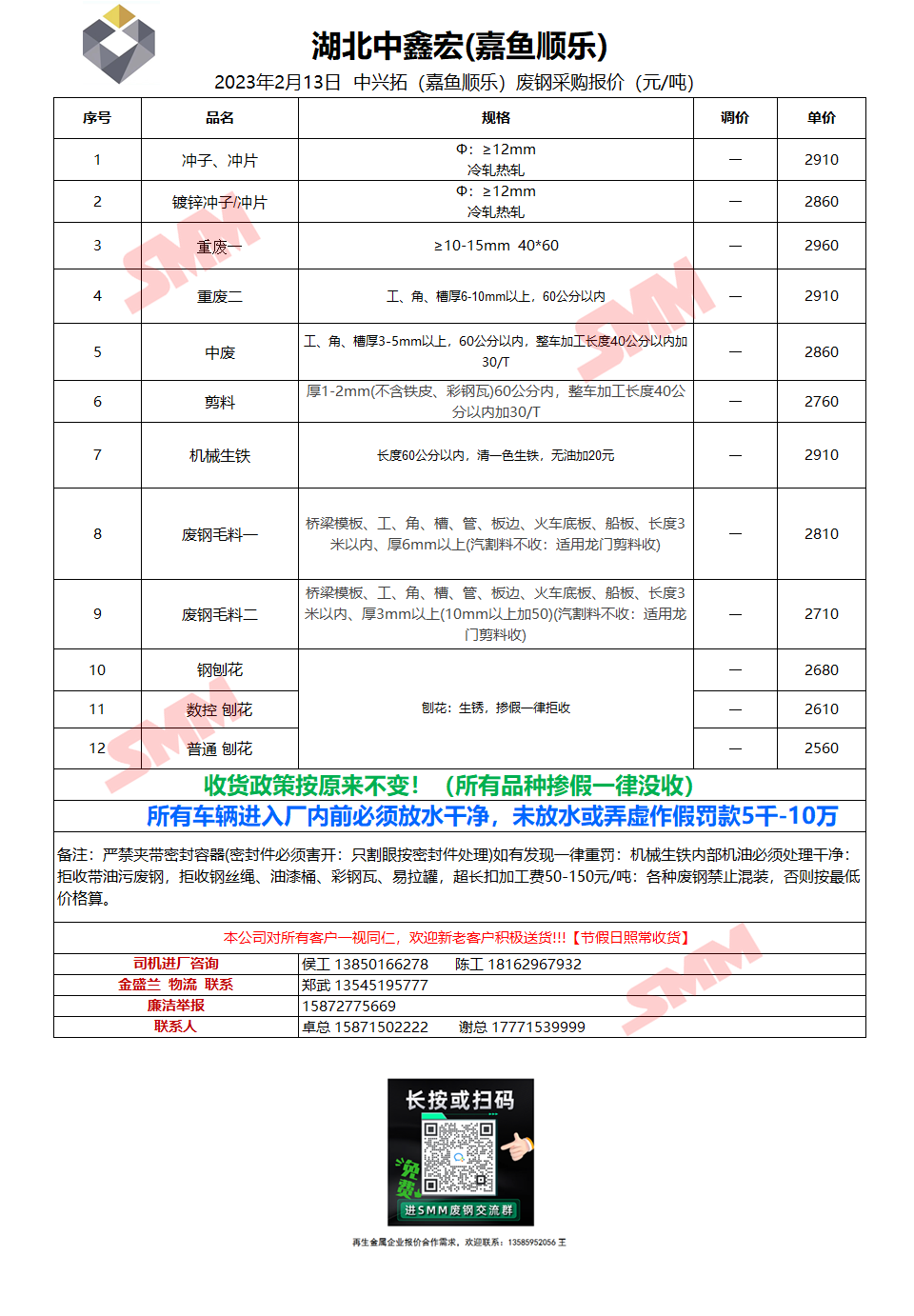 2月13日湖北中鑫宏(嘉鱼顺乐) 废钢采购报价