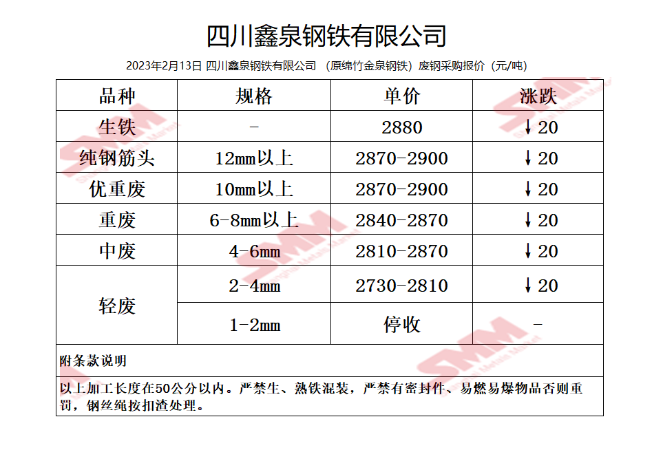 2月13日鑫泉钢铁(原绵竹金泉钢铁) 废钢采购二次报价